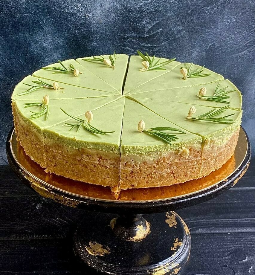 Лимонный чизкейк, мусс с добавлением зелёного чая матча и песочное сабле с добавлением сладкого крекера.